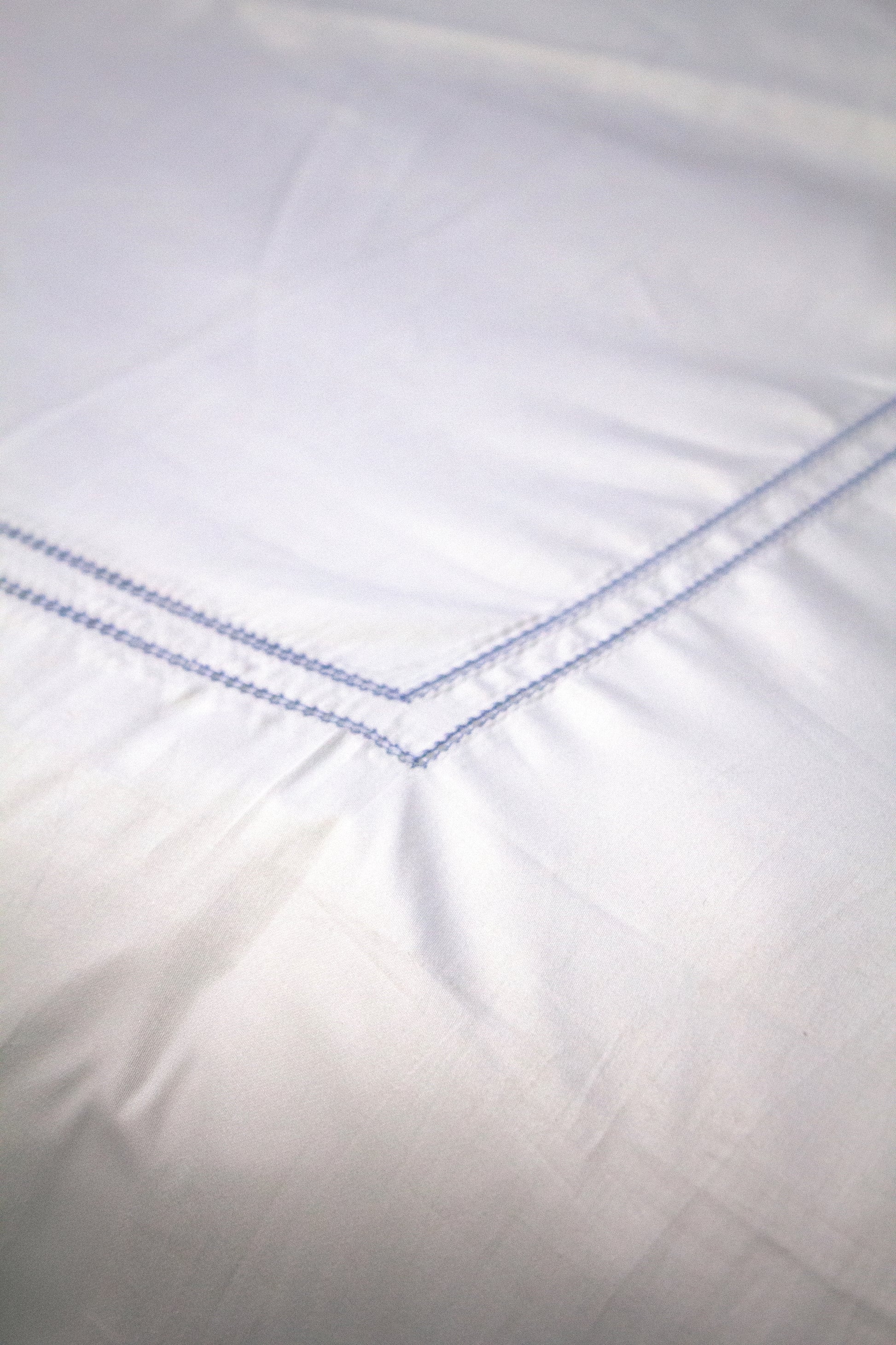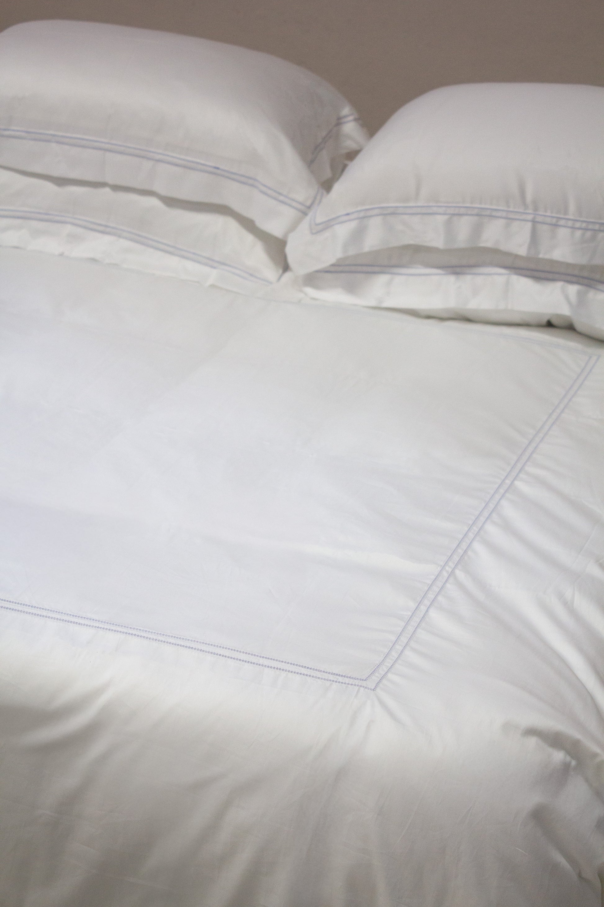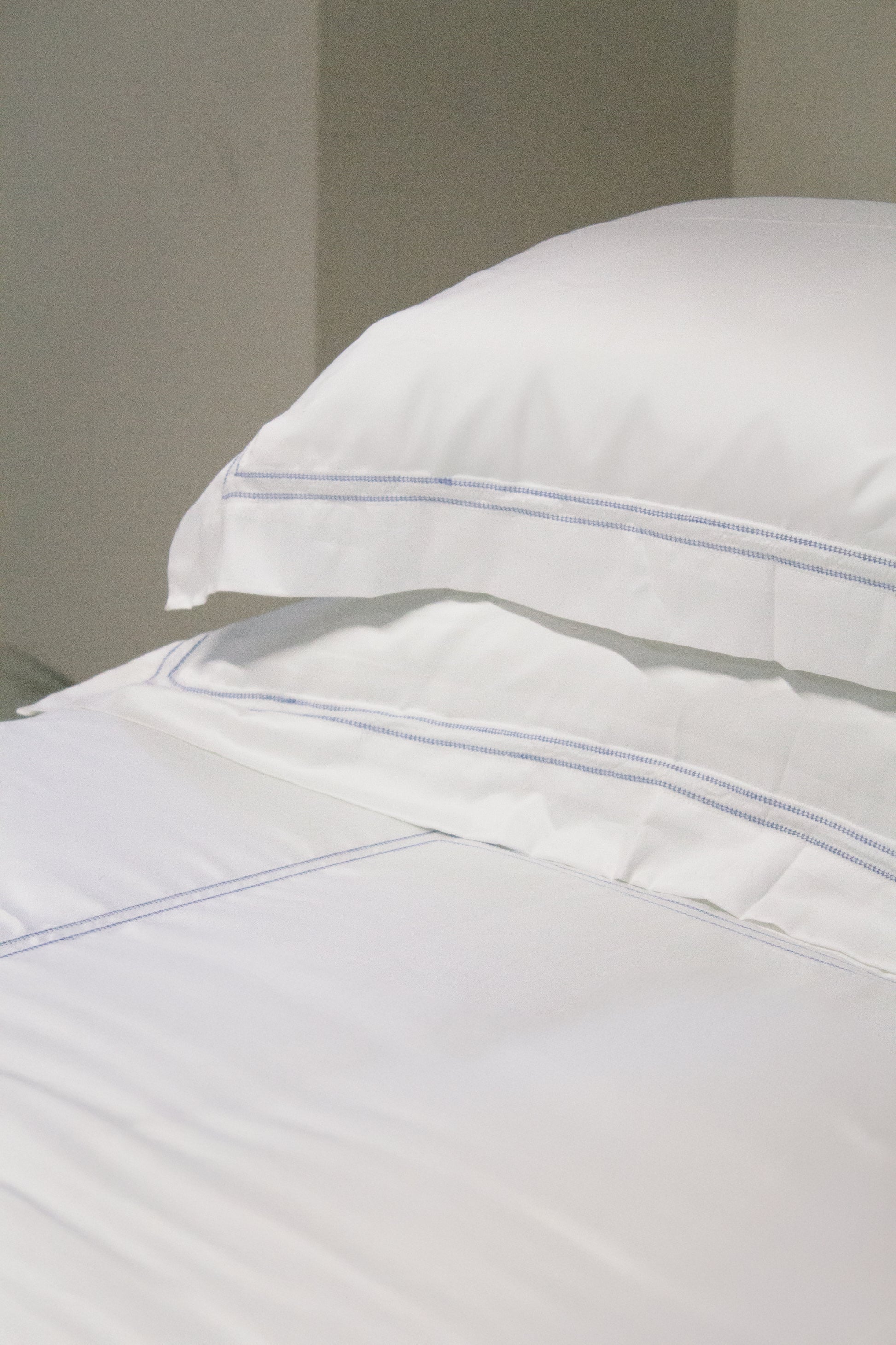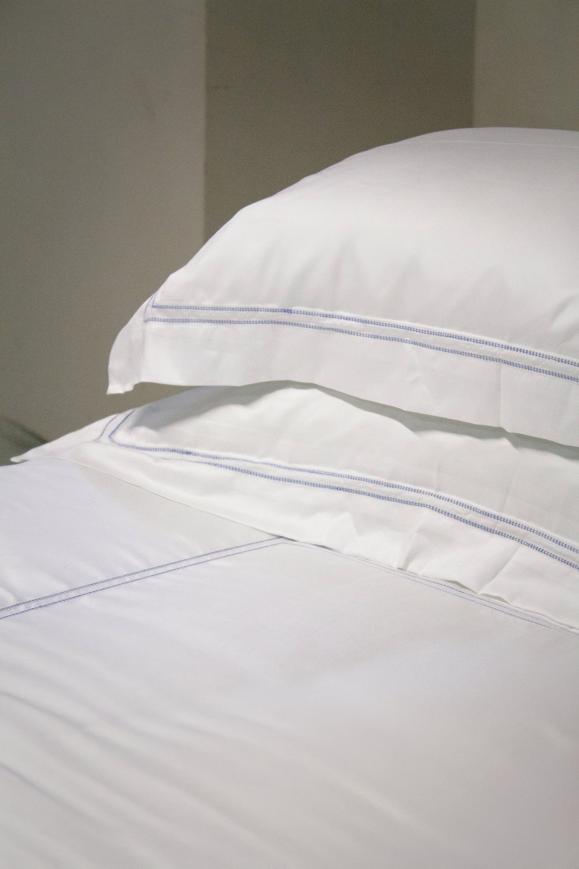 The Brook Set pairs timeless minimalism with airy refined detail, featuring a subtle two-line hemstitch in light blue on the pillowcases and duvet cover. This delicate accent adds a soft touch of color and elegance.